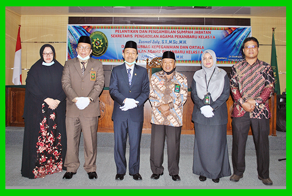 Ketua Pengadilan Agama Pekanbaru Kelas 1.A Drs. H. Usman, S.H., M.H melantik dan mengambil sumpah jabatan Sekretaris Pengadilan Agama Pekanbaru, dan Kasubbag Kepegawaian dan Ortala Pengadilan Agama Pekanbaru Kelas 1.A. Acara dilaksanakan diruang Sidang I Muadz Bin Jabal pada Jum'at, tanggal 14 Agustus 2020 Masehi bersamaan 24 Dzulhijjah 1441 Hijriah Pukul 09.00 WIB.
